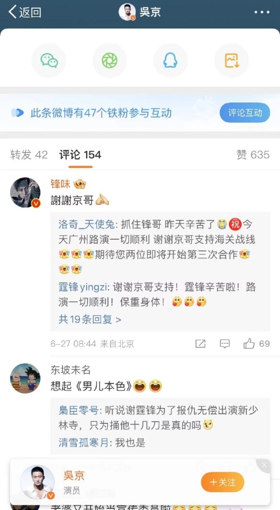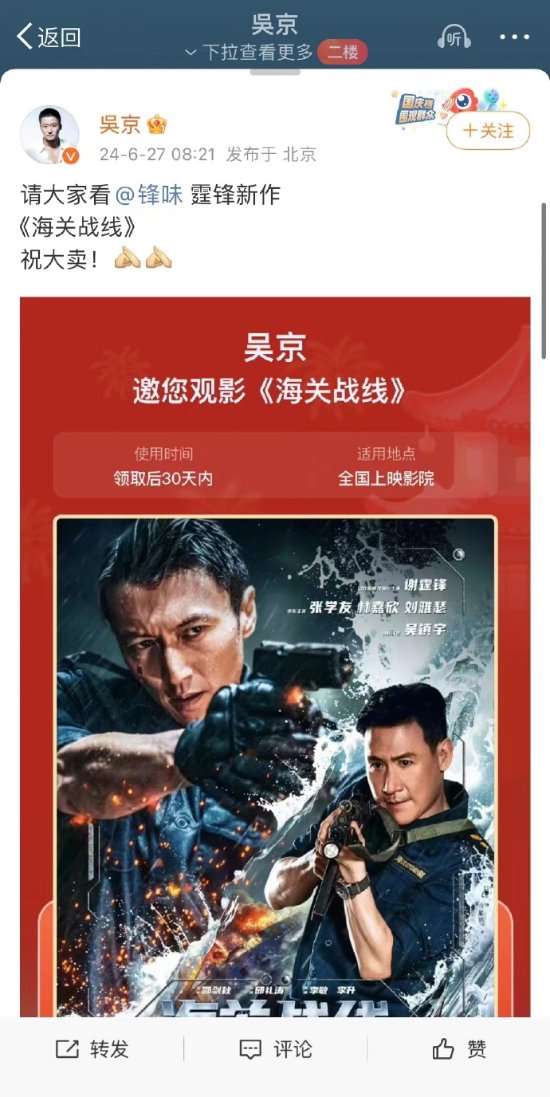 谢霆锋《海关战线》明日上映,吴京包场支持并祝大卖。