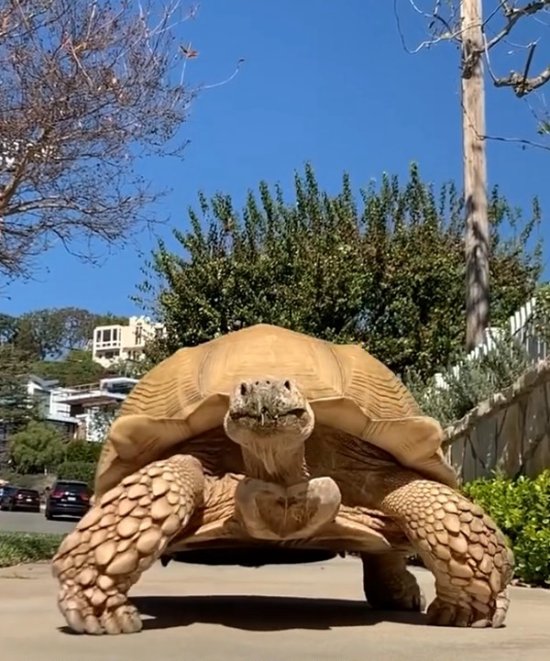 她刚得到这只龟的时候,Tiptoe还是小小一只,结果二十多年后不仅人变大了,龟也变得巨大无比。走街上遛龟的时候,总有一种穿越到恐龙时代的感觉。