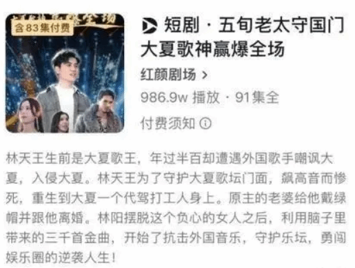 从剧情简介“林天王生前是大夏歌王,年过半百却遭遇外国歌手嘲讽大夏,入侵大夏⋯⋯”以及剧名都能看出,“五旬老太”“歌王”“外国歌手”,都和当下热播的《歌手2024》高度重合。