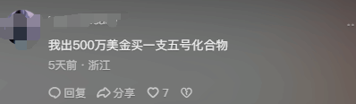 网友追问:“有没有5号化合物卖?”“我出500万美金买一支五号化合物。”5号化合物是剧中沃特公司研发出的药剂,喝下能使人获得超能力。