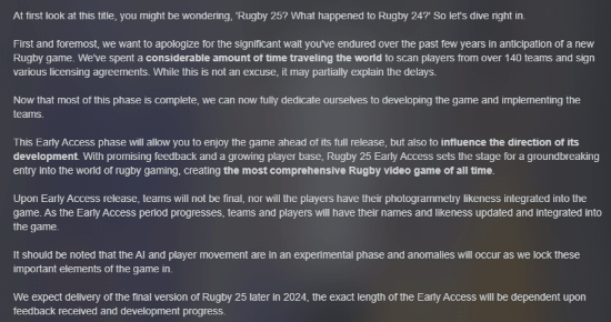 由Big Ant Studios开发的体育游戏《橄榄球24》原计划在2023年橄榄球世界杯期间推出。其开发商于昨日承认,由于游戏已经被推迟了很长时间,官方不得不将游戏改名为《橄榄球25》。