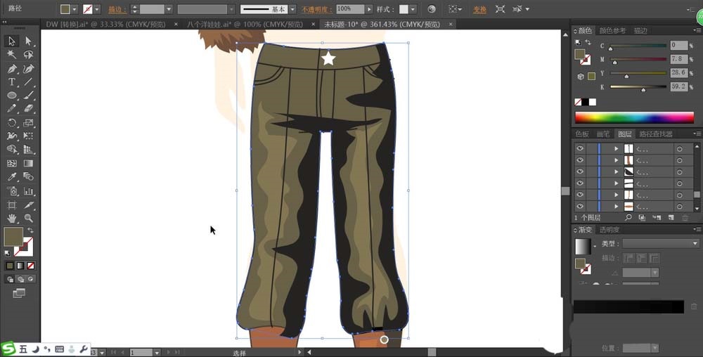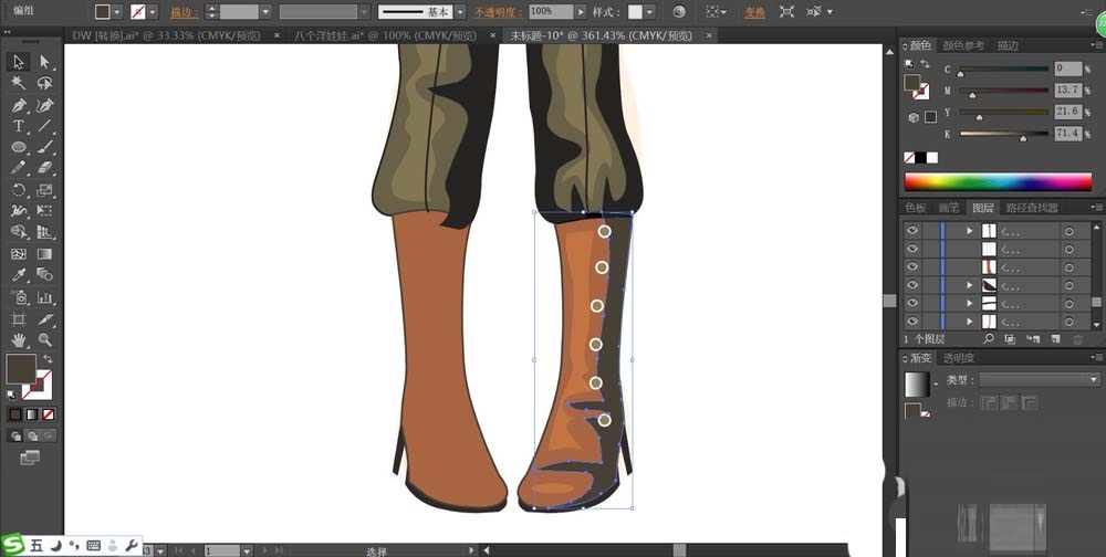 接着继续画出女生的长裤,我们用不同明度的茶色来填充长裤上面的高光与暗区路径,让暗光呈现在裤子的右侧边缘。