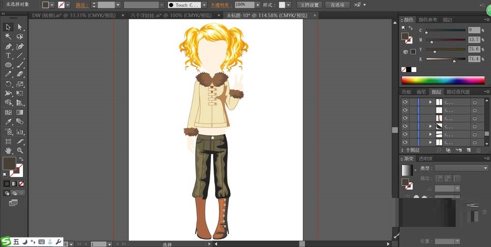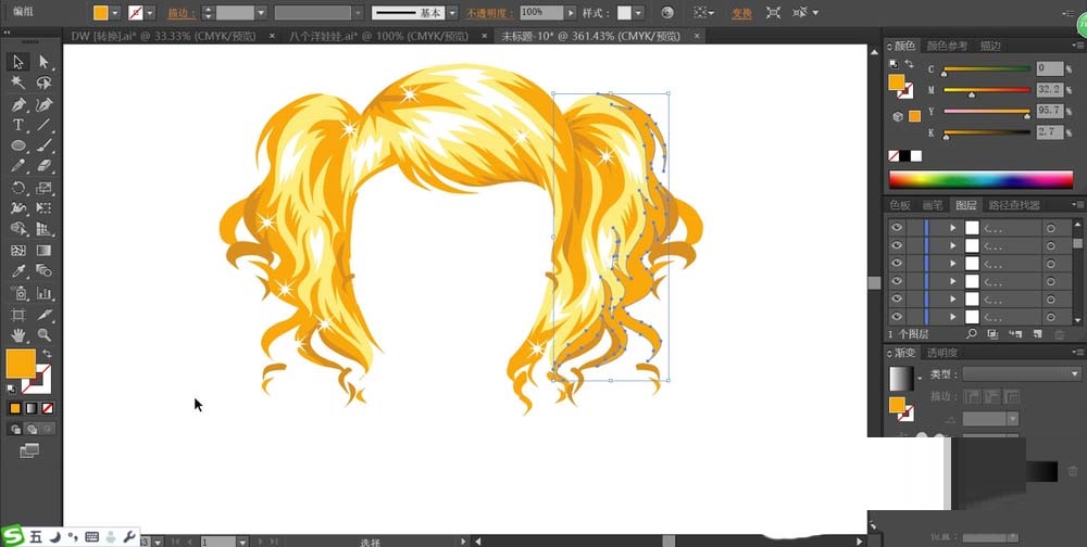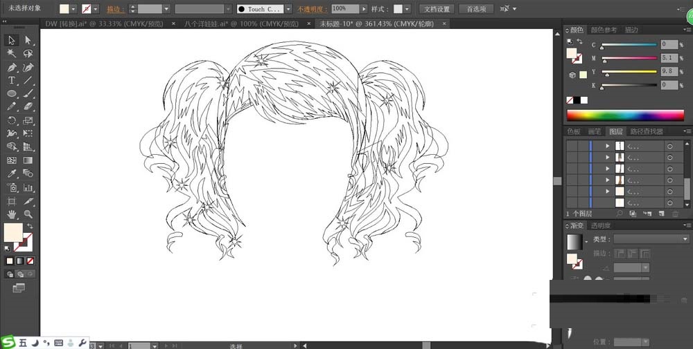 我们需要先打开ai软件,先用钢笔画出女生的发型,我们把不同的色调区域一一绘制出来在头发上面。
