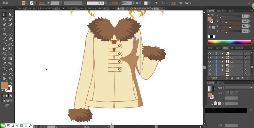 我们用不同明度的咖啡色与米黄色来搭配填充毛领、袖口还有上衣的主体区域,暗光区域设计在上衣的右侧,我们用淡咖啡色填充。