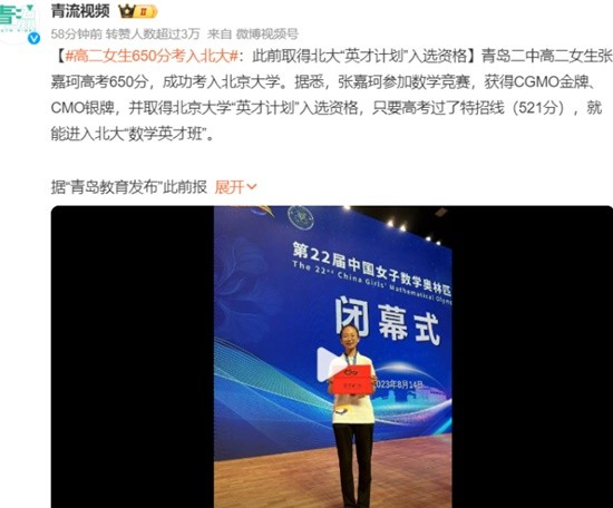 据青流视频报道,青岛二中高二女生张嘉珂高考650分,成功考入北京大学。