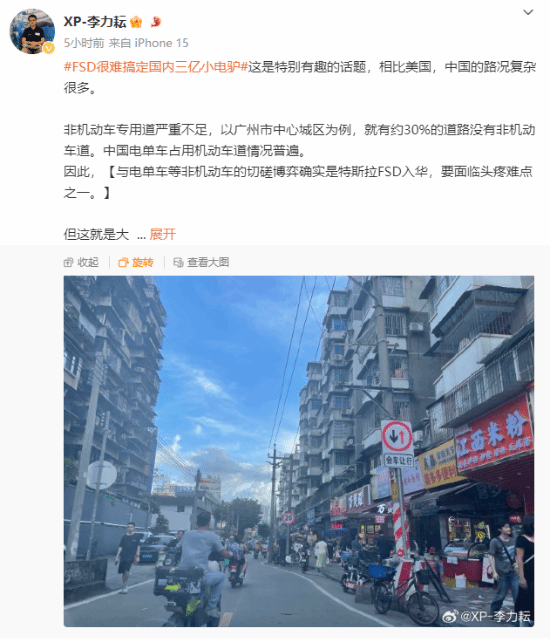 小鹏自动驾驶负责人李力耘在微博发文称“FSD很难搞定国内三亿小电驴,这是特别有趣的话题,相比美国,中国的路况复杂很多。”