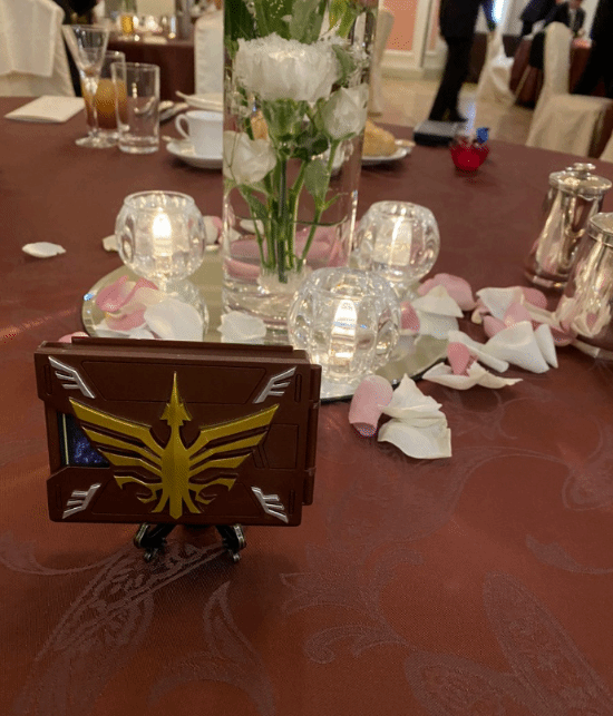 可以看到,每一桌宴客桌的上面都有很多个变身卡盒,迎宾桌上还摆上推主收藏的一些可动模型作为装饰物,连蛋糕都有着特殊的摆设。除此之外,饰演假面骑士海鳐的变身者——手冢海之的演员也发来贺电,还附上了卡片。