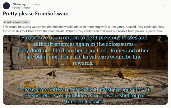 Reddit社区中,用户Hexent_Armana发布了一则请求,建议在游戏的竞技场中增加重新挑战BOSS的功能,他表示,这些战斗不必掉落常规战利品,只要有一些像是泪滴幼体这样的次要物品就行。