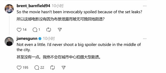 对于一位粉丝在Threads上询问关于泄露的《超人》片场照片的问题,古恩回应道:“完全预料到了。”当被问及是否涉及了任何剧透时,他回答:“一点也没有。我绝不会在市中心的外景拍摄中拍摄重要的剧透。”