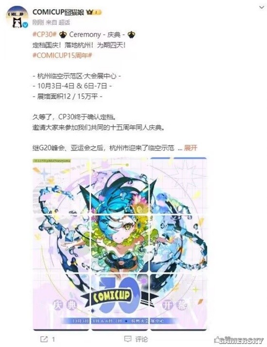 去年反复被骂上热搜的CP30,终于确认定档。离开魔都落户杭州,入驻杭州大会展中心。10月3日—4日 & 6日-7日 为期四天,分为两期。