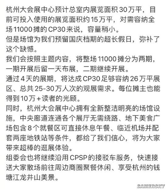 “但是场馆为我们预留国庆档期的超长假日,通过4天的展期,将达成CP30足够容纳26万平展区、总共25-30万人次的观展需求。每位摊主也能得到10万+读者的光顾。”