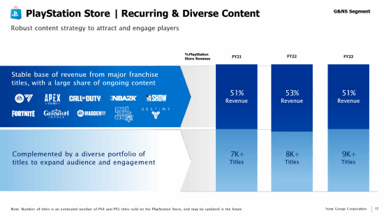 在此期间,玩家在PlayStation Store购买过超过9000款游戏,但有相当大的一部分钱被花在了十几款游戏上。这些游戏占据了其23财年总收入的51%,约为150亿美元,