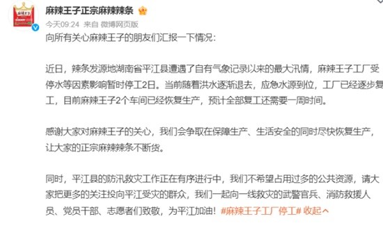 7月2日,“麻辣王子”有关负责人表示,工厂受到停水、交通受阻、通信中断等方面影响,目前是停工的状态,预计至少停工5天。