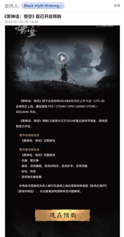 《黑神话》发邮件提醒玩家预购:8月20日10点解锁