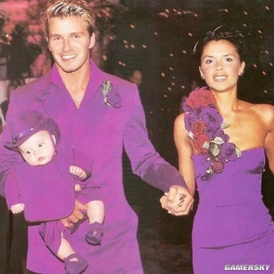 照片中唯一缺席的是25岁的布鲁克林·贝克汉姆,他是贝克汉姆夫妇的长子。当时还在襁褓中的布鲁克林也出席了婚礼。他穿着迷你版紫色西装,戴着一顶相配的牛仔帽,看上去有些呆萌。