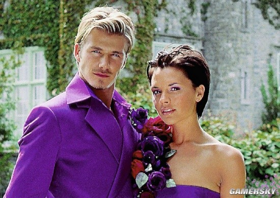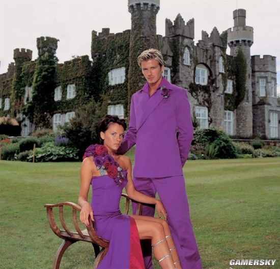 庆祝结婚25周年 贝克汉姆维多利亚复刻99年紫色礼服