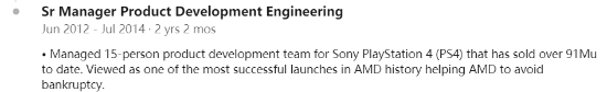 AMD高管简历显示:索尼PS4的成功让AMD免于破产