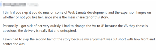 玩家对于本资料片的不满主要来源于7.0剧情的主角,图莱尤拉联合王国公主乌克·拉玛特(Wuk Lamat)。一方面,玩家埋怨7.0的故事主角从“光呆”转移到了她的身上,另一方面,这个NPC的英文配音真的非常糟糕,以至于人们想跳过所有涉及她的剧情。据悉,这个角色的配音演员是一位跨性别人士,英文区也是各版本配音演员中唯一启动跨性别人士的地区。