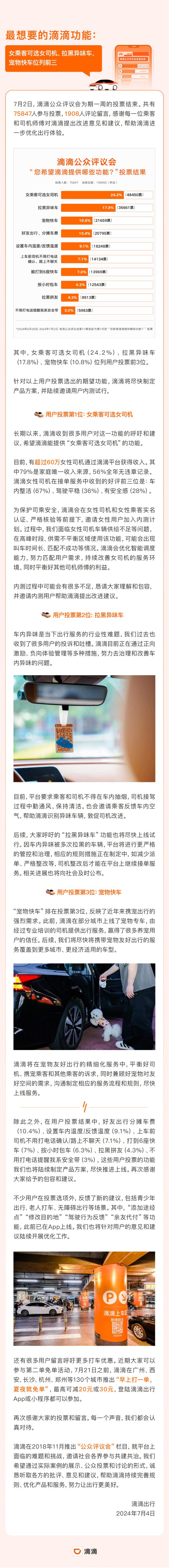 今日,滴滴公众评议会“您希望滴滴提供哪些功能”为期一周的投票结束。共计75847人参与投票,1908人评论留言。