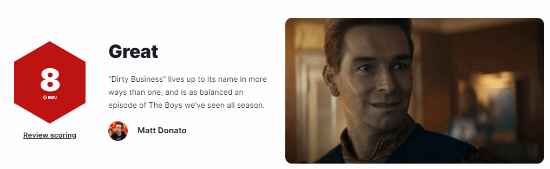 《黑袍纠察队》第四季第六集“Dirty Business”已于7月4日上线,外媒IGN给本集打出了8分评价,是该季迄今以来的最高评分。