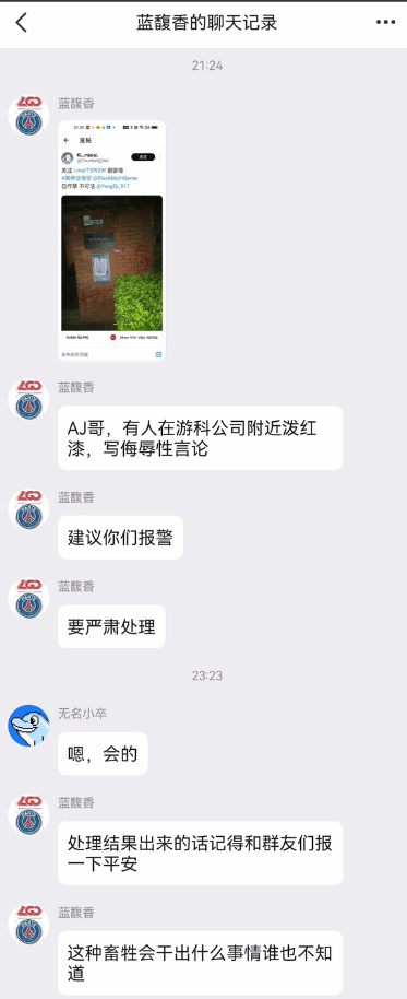 有贴吧网友晒出与游科内部人士的聊天记录,建议官方报警严肃处理此事,避免更多威胁事件发生保护人身安全,内部人士也给出了肯定的回复。