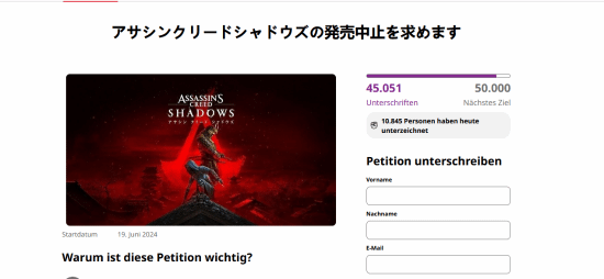 此前我们曾报道,有日本玩家在请愿网站change.org上发起了一项请愿活动,要求育碧取消发布《刺客信条:影》。原因是游戏有大量的内容和史实是不相符的。继此前近2.5万人在请愿书上签名后,近日这一数字再创新高。
