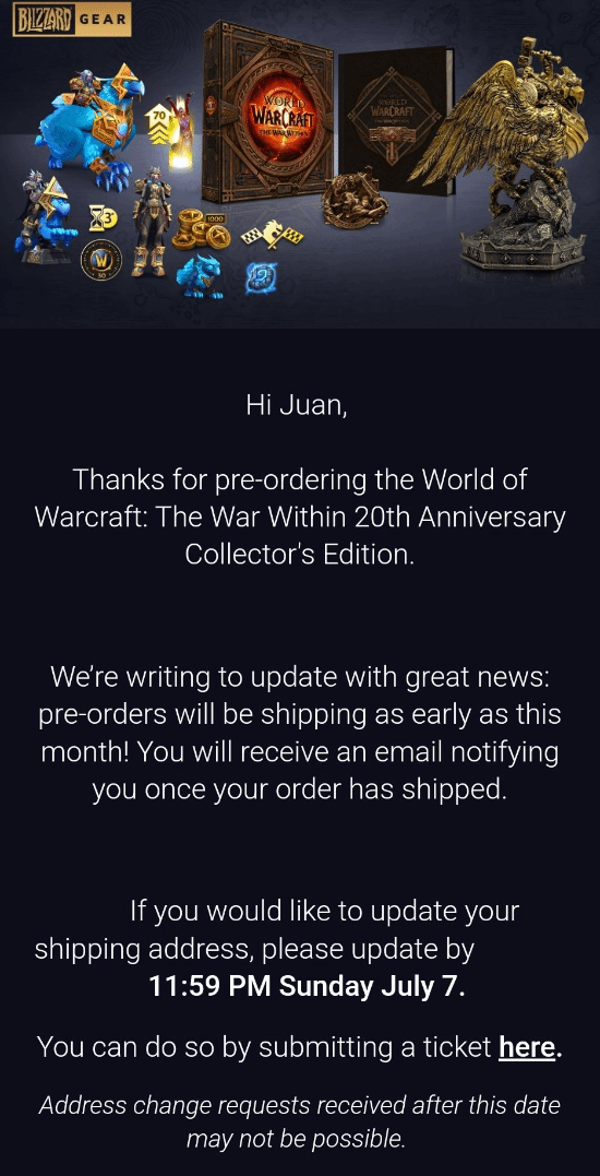 通过Twitter用户@gummerpaladin的消息,我们得知暴雪Gear Store已经向购买了《魔兽世界:地心之战》收藏版的玩家发送了通知,告知他们收藏版将在本月内发货。