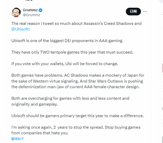 Grummz的火力则更为凶猛,他声称育碧已经是3A游戏领域里最大的DEI内容支持者,即将于今年推出的两款作品:《刺客信条:影》和《星球大战:亡命之徒》都在这方面有不小的问题:前者罔顾历史选择黑人角色;后者女性设计也有嫌疑。