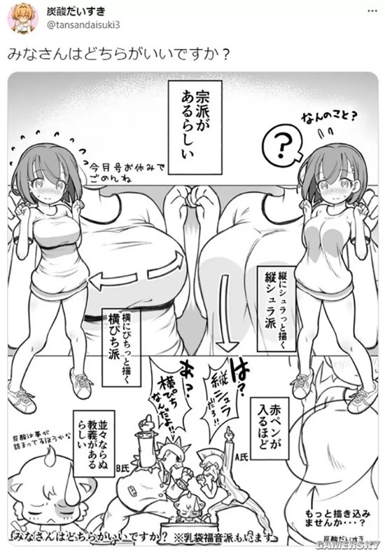 日本漫画家「碳酸だいすき」最近提出了一种论点,指出二次元的胸部画法其实可以分成两大派系。