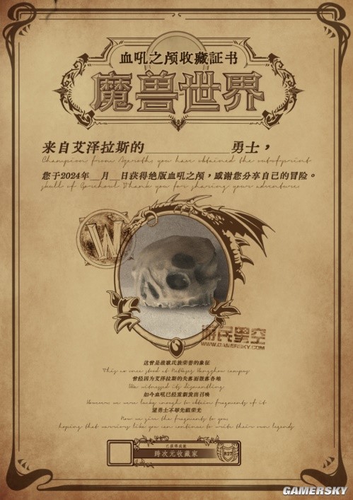 血吼之颅收藏证书预览,实际效果以印刷实物的为准