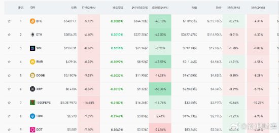 今日,比特币再度大跌超5%,失守55000美元关口。据Coinglass数据显示,截至发稿,比特币现报54887美元/枚,24小时内跌幅为5.71%。比特币价格的大幅跳水,带动虚拟货币市场全线重挫,市值排名前10的加密货币跌幅多集中在6%~9%之间。