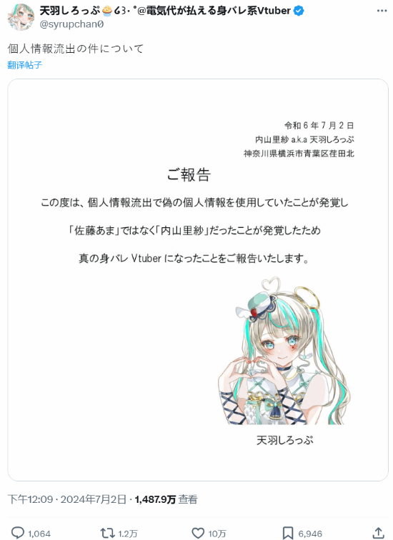 据媒体报道,在YouTube拥有众多订阅者的虚拟主播天羽しろっぷ在7月2日被亲友告知自己的信息已被公开,包含注册Niconico所使用的住址、电话、名称等。但万幸的是,天羽しろっぷ表示自己现在已从泄露的个人地址搬出去,电话号码与银行帐户等资料都更换完毕。