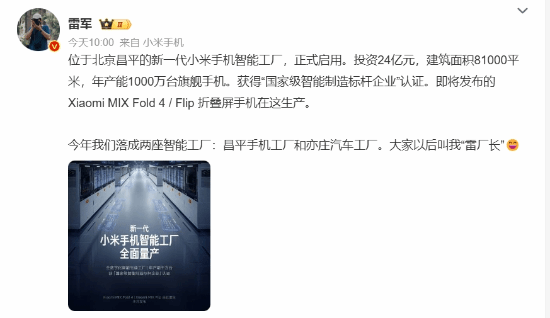 雷军表示:“今年我们落成两座智能工厂:昌平手机工厂和亦庄汽车工厂。大家以后叫我‘雷厂长’。”