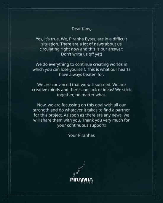 而在今年一月份,业界就已传言称Piranha Bytes将关闭,随后Piranha Bytes发布了官方声明进行了辟谣,但也承认情况并不乐观。该工作室当时声称,正在竭尽全力维持正常运转。