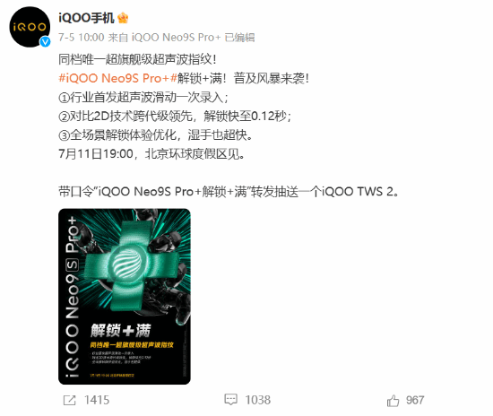 近日,vivo旗下子品牌iQOO的官方微博正式宣布,旗下iQOO Neo9S Pro+手机将搭载“同档唯一超旗舰级超声波指纹”技术。官方表示,行业首发超声波滑动一次录入;对比2D技术跨代级领先,解锁快至0.12秒;全场景解锁体验优化,湿手解锁的速度也超快。