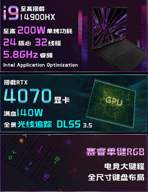 据介绍,i9-14900HX处理器拥有24核心32线程,睿频5.8GHz,至高200W单烤功耗。散热系统配备两个无双风扇、冷锋鳍片。支持WIFI7网络、双雷电4和SD卡扩展。屏幕分辨率为3840*2400,120Hz刷新率。