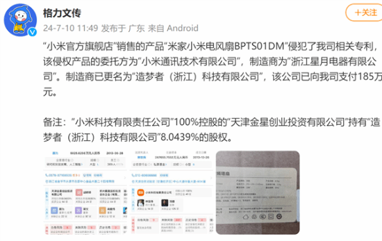 格力电器:涉侵权制造商已支付185万元 系小米旗下供应商和生态链企业