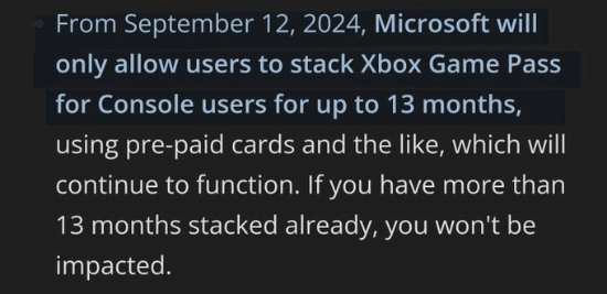 今日,微软公布了XGP未来的一系列改动。有玩家发现,除了人人关注的价格上涨外,微软还将最多36个月的时长累积降低到了13个月。