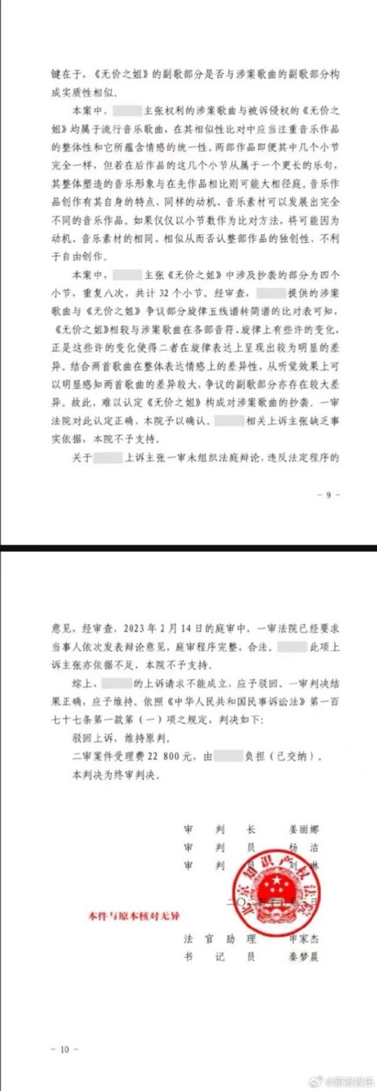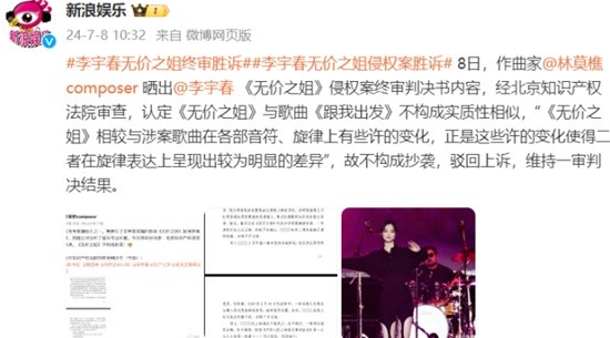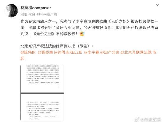 据新浪娱乐报道,8日,作曲家林莫樵晒出李宇春《无价之姐》侵权案终审判决书内容。
