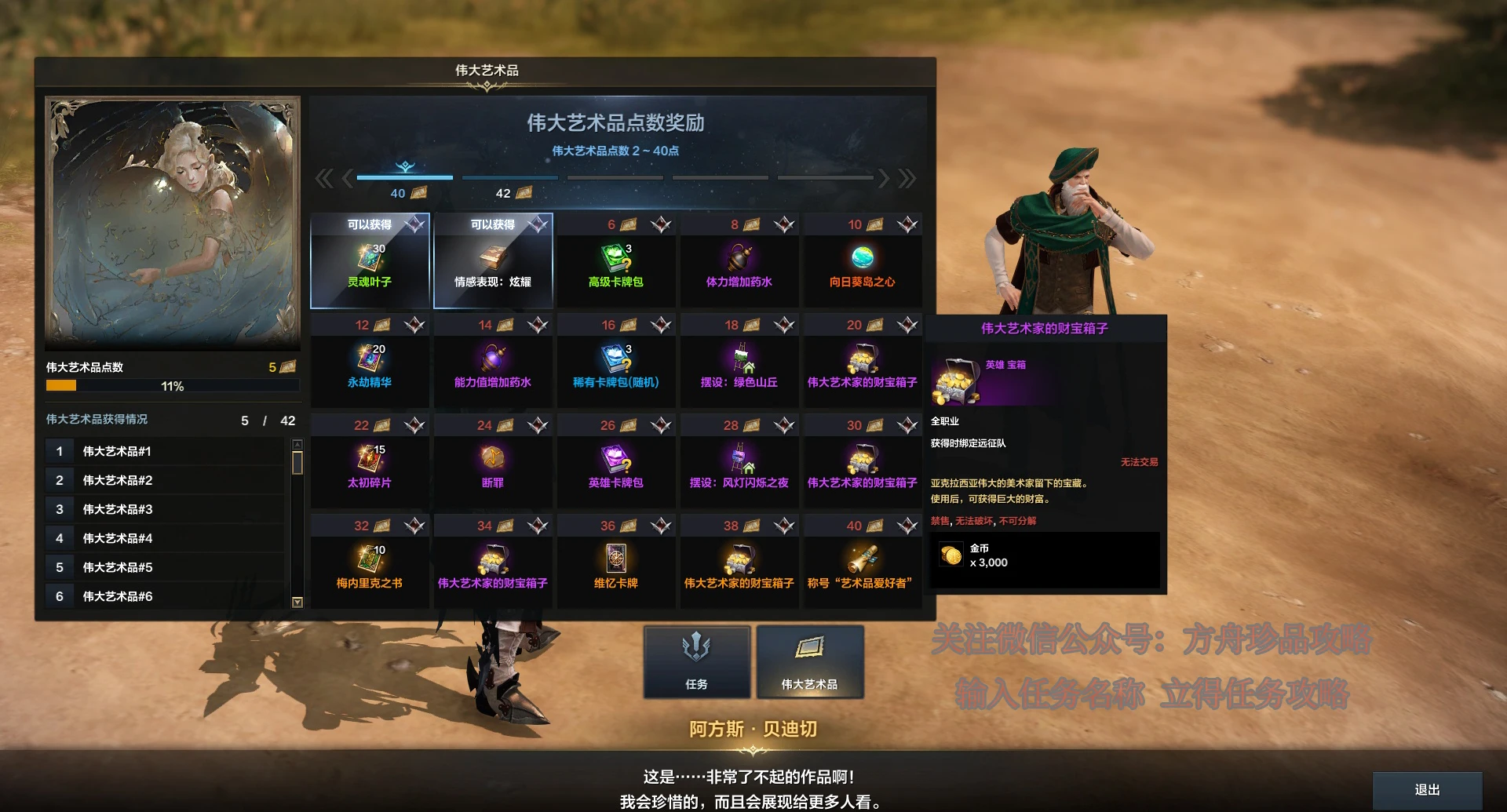 伟大的收藏品:通过冒险之书收集、副本、任务奖励等途径收集伟大的艺术品会增加伟大艺术品点数,累计点数达到20,30,34,38点时(目前测试服只开放到最高42点)可在向日葵岛的NPC阿方斯·贝迪切处获得伟大艺术家的财宝箱子,分别可以获得3000,5000,8000,13000金币
