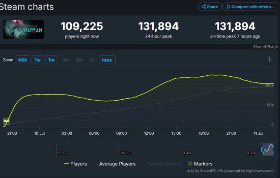 网易开放世界生存游戏《七日世界》已于昨日在Steam免费上线,目前,其24小时玩家峰值已达到131894人,十分火爆。