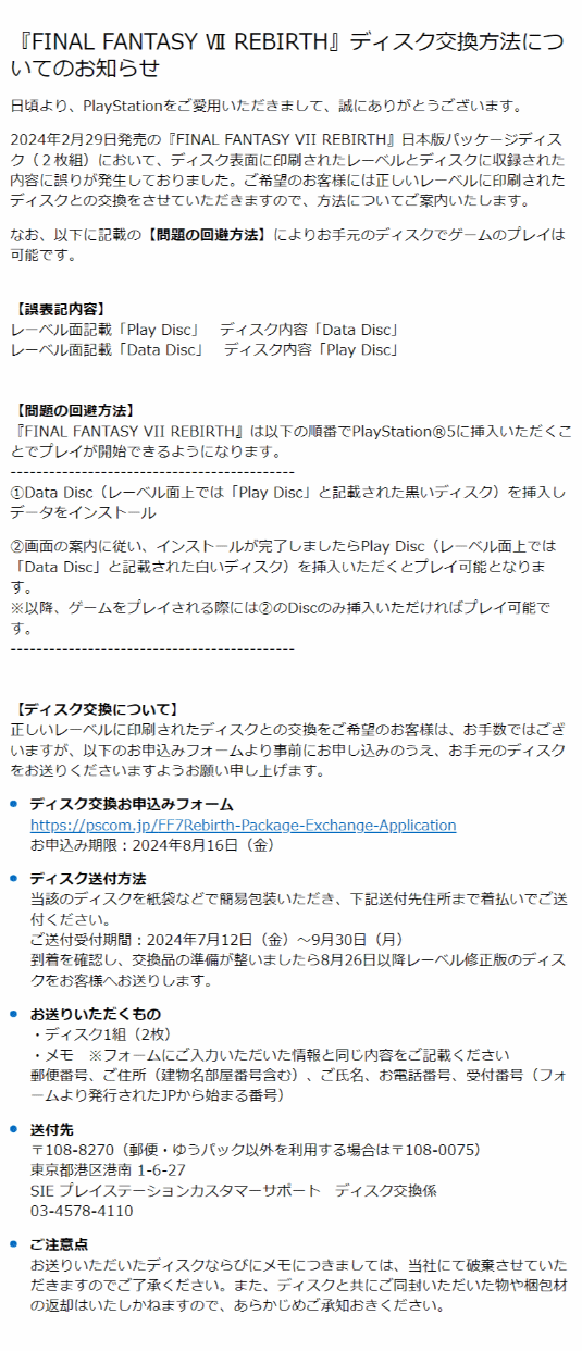 索尼推出《FF7重生》换盘活动:之前把两张碟印反了