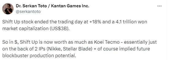 日本游戏产业分析师Dr. Serkan Toto于推特上透露,Shift Up在当日收盘时股价大涨18%,市值4.1万亿韩元(30亿美元),因此,以美元计算的话,Shift Up现在的市值与日本老牌大厂光荣特库摩一样多,而Shift Up目前仅有《剑星》和《胜利女神:NIKKE》这两个IP就取得了如此成就。