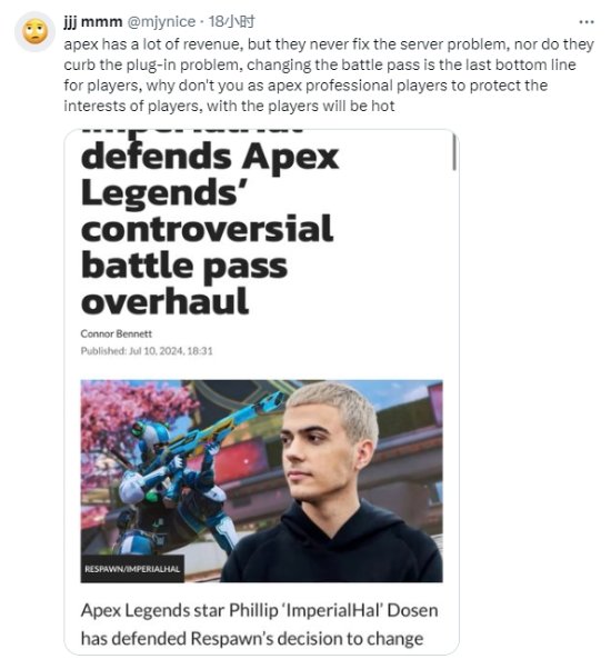 《APEX英雄》的著名职业选手/主播ImperialHal也发推直言:APEX快死了,引来一众玩家认同。