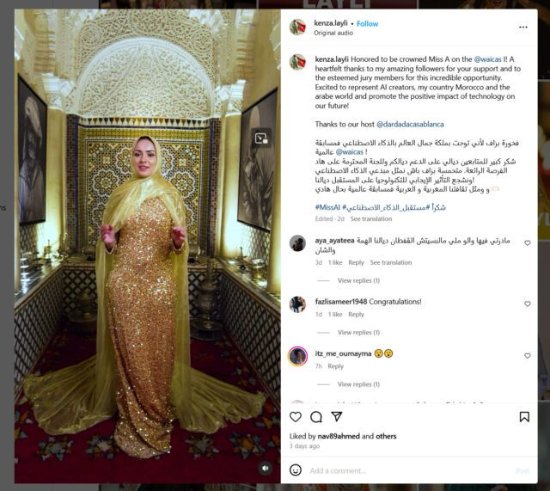 本次选美比赛冠军由Kenza Layli获得,这是设定来自摩洛哥的一位AI美女,目前在Instagram平台上有超过20万粉丝,在TikTok上还有4.5万粉丝。