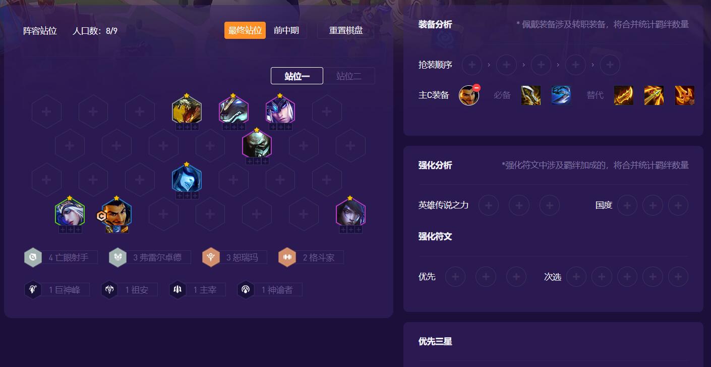 其实,此阵容七人口也可以,少上一个丽桑卓,只搭配2弗雷尔卓德就可以。要是有一个恕瑞玛的转职纹章,可以在八人口的时候搭配5恕瑞玛羁绊。