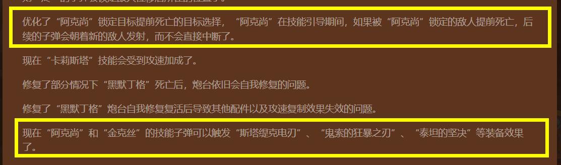 不过,7月6日更新之后,阿克尚获得的优化,首先,在技能引导期间,如果被“阿克尚”锁定的敌人提前死亡,后续的子弹会朝着新的敌人发射,而不会直接中断了。其次,阿克尚的技能子弹可以触发“斯塔缇克电刃”、“鬼索的狂暴之刃”、“泰坦的坚决”等装备效果了。