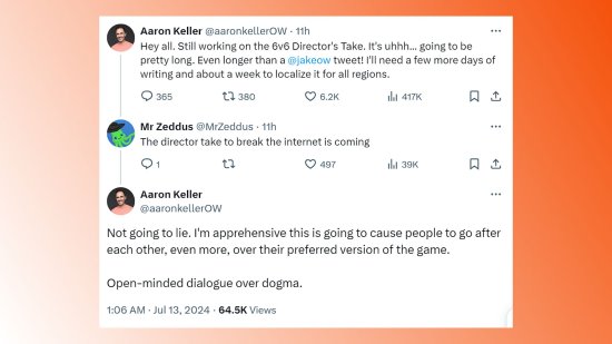 《守望先锋2》的游戏总监Aaron Keller度对此发推表示:“大家好。我仍在撰写6v6的制作人意见。这篇文章会比较长……我还需要几天时间来写作,大约一周的时间来本地化所有地区的内容”凯勒在推特上说。一位用户随后表示,这篇总监意见将会引爆互联网,凯勒则回应说他对这篇文章可能引发的反应感到紧张。“不瞒你说。我担心这会导致人们为了自己喜欢的游戏版本而互相攻击得更厉害。但开诚布公的对话胜过教条。”