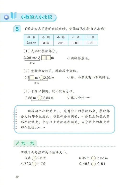 在最新人教版小学四年级数学下册课本中,我们可以找到相关知识点:比较两个小数的大小,先看它们的整数部分,整数部分大的那个数就大;整数部分相同的,十分位上的数大的那个数就大;十分位上的数也相同的,百分位上的数大的那个数就大……你搞懂了吗?休闲益智
