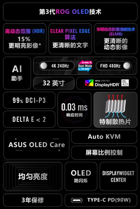 这款新品支持4K 240Hz超高清模式、FHD 480Hz超高刷模式自由切换,此外,0.03ms(GTG)的响应时间确保在激烈的游戏中也不会产生运动模糊。ROG OLED防闪屏技术提供三种刷新率范围(强劲/平衡/关闭),可在刷新率波动时减少闪烁。